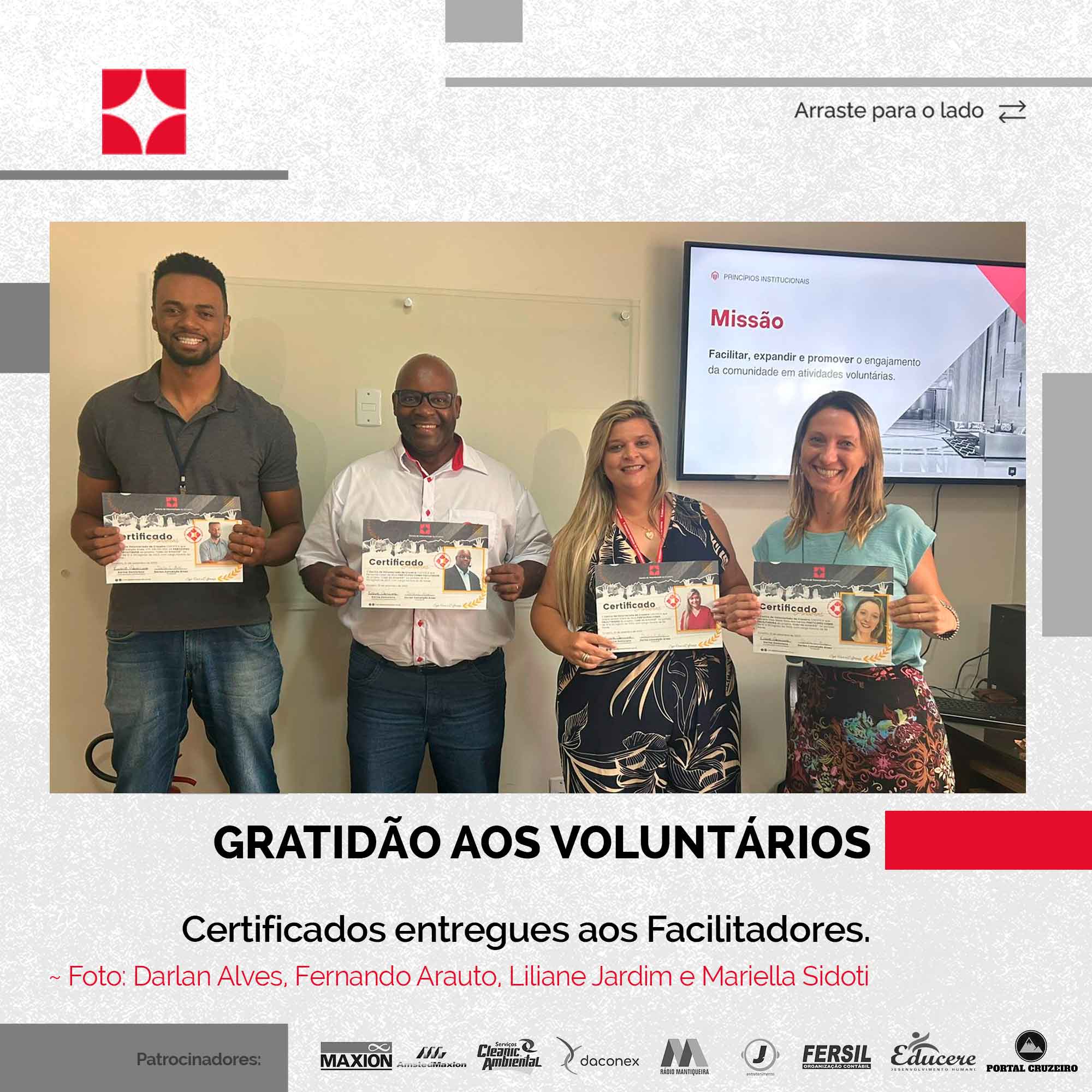 O documento foi emitido pela Secretaria Municipal de Educação e outro pelo Centro de Voluntariado de Cruzeiro. O espírito dedicado e trabalho árduo foram fundamentais para o sucesso dos diversos projetos realizados.